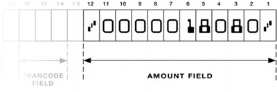 The amount field is a fixed format field that occupies the extreme right position. Positions 1 to 12 are reserved for this field. The first position, 1, must be opened by an Amount symbol. There are then ten spaces for the amount that must include two positions for the cents. The dollar amount must be right justified and zero filled to the left.